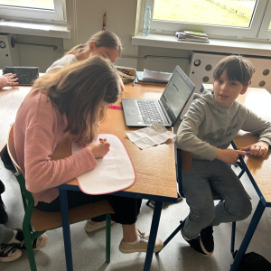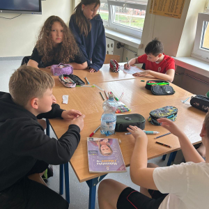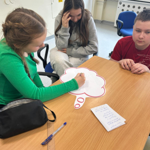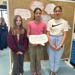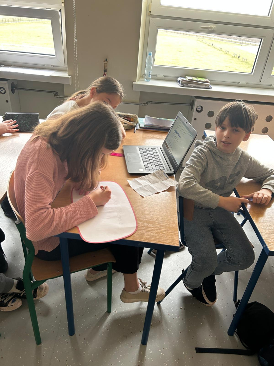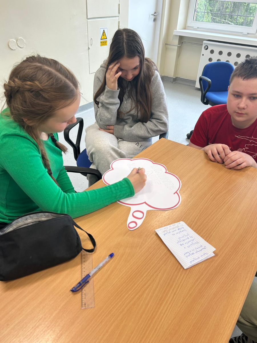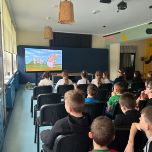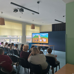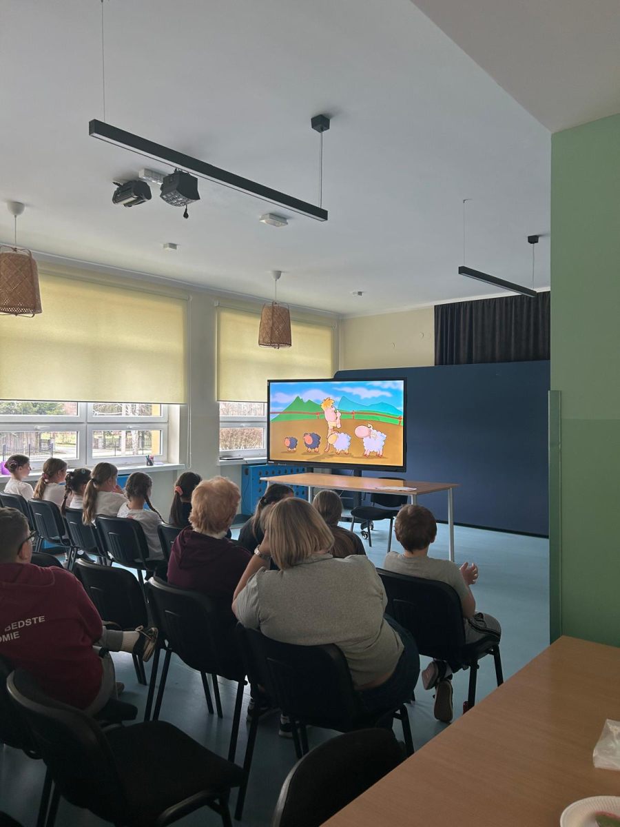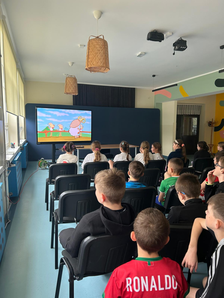 Następnie uczniowie obejrzeli serię filmów edukacyjnych „Owce w sieci”, przygotowanych przez Safer Internet Polska. Każda klasa pracowała nad innym odcinkiem. Zadaniem uczniów było zrozumienie przesłania filmu oraz – z pomocą wychowawcy – zapisanie go na przygotowanej chmurce.