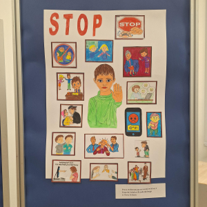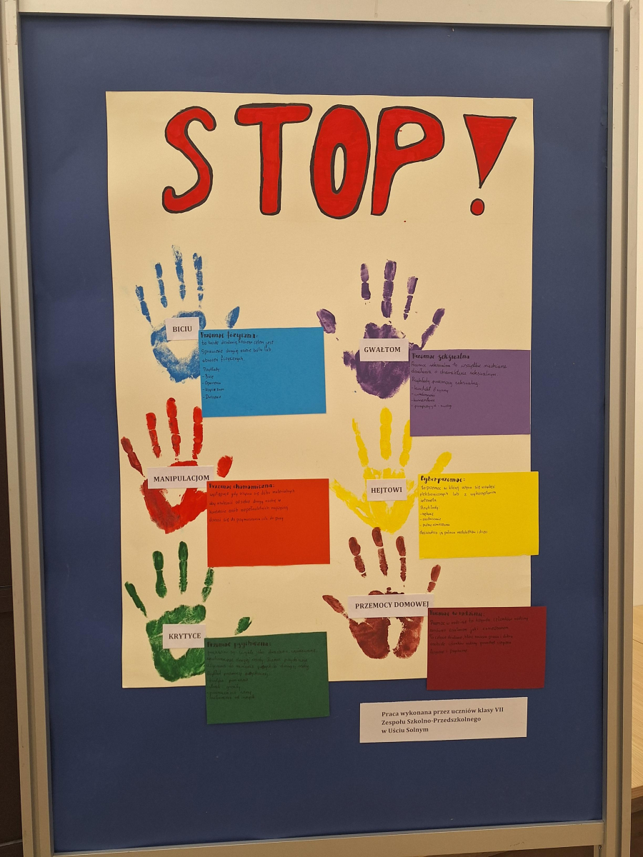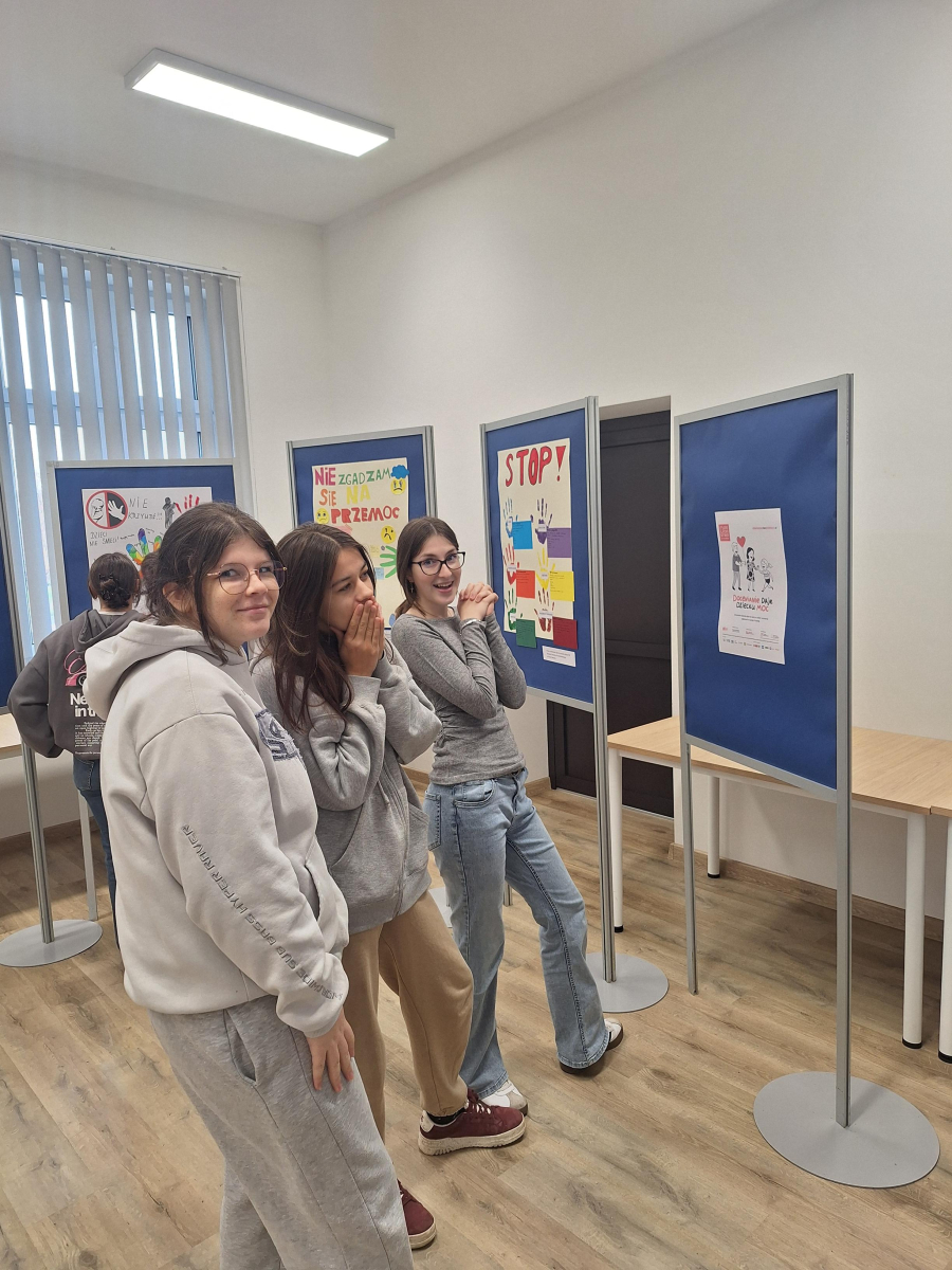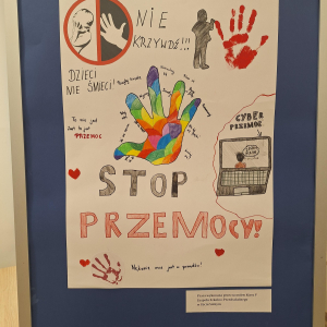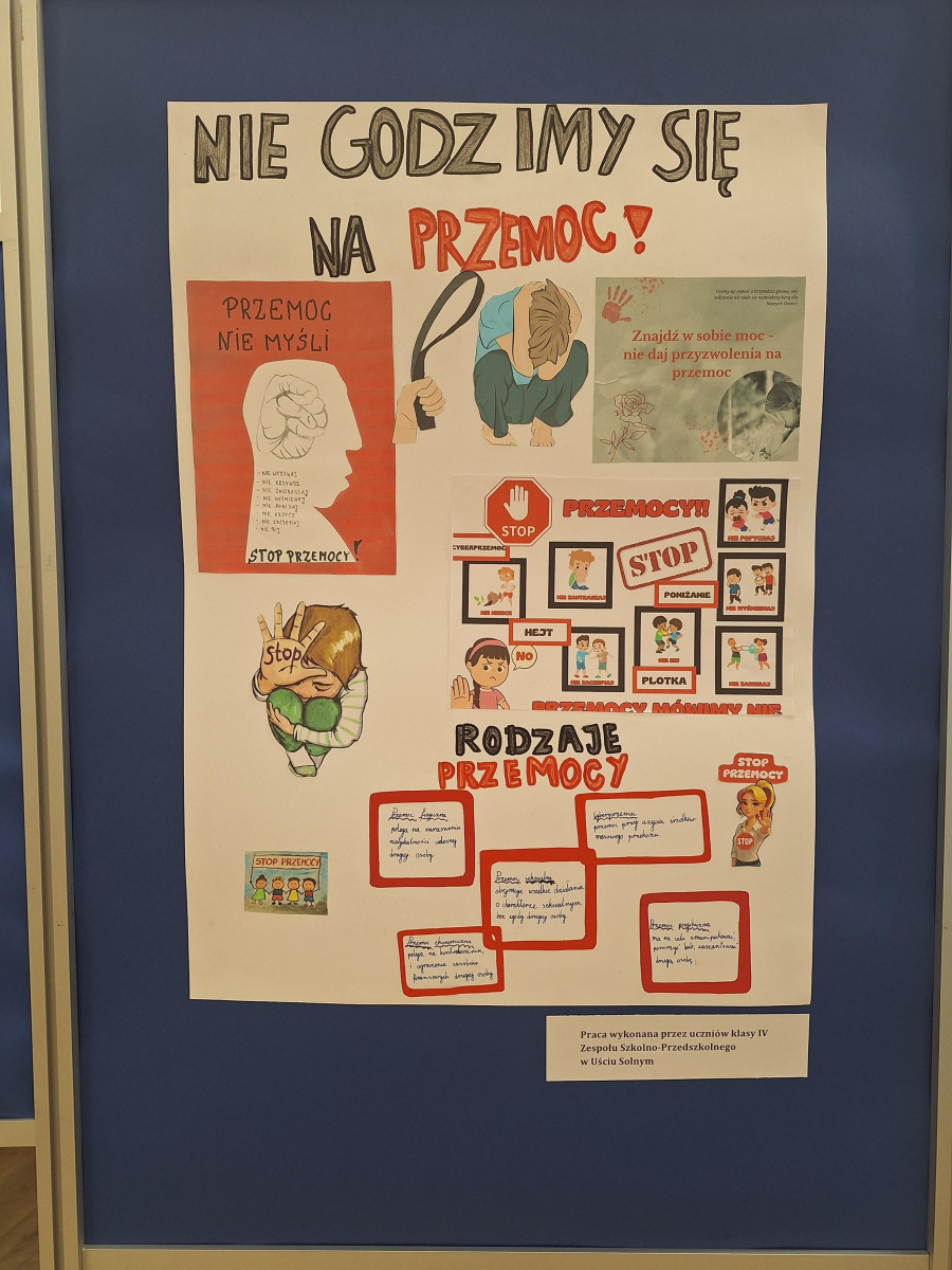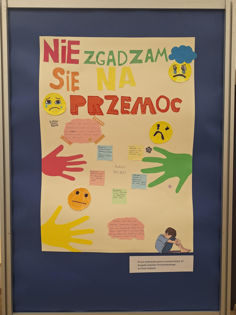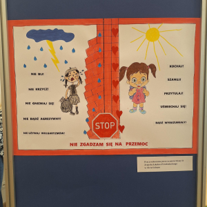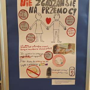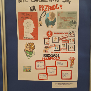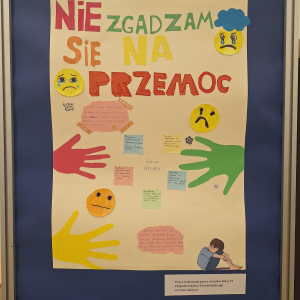 Wszystkie klasy włączyły się w twórczą część projektu, przygotowując plakaty pod hasłem „Nie zgadzam się na przemoc”. Uczniowie, wykorzystując różnorodne techniki plastyczne, wyrażali swoje przemyślenia, emocje i postawy wobec przemocy. Powstało wiele ciekawych, poruszających i skłaniających do refleksji prac.