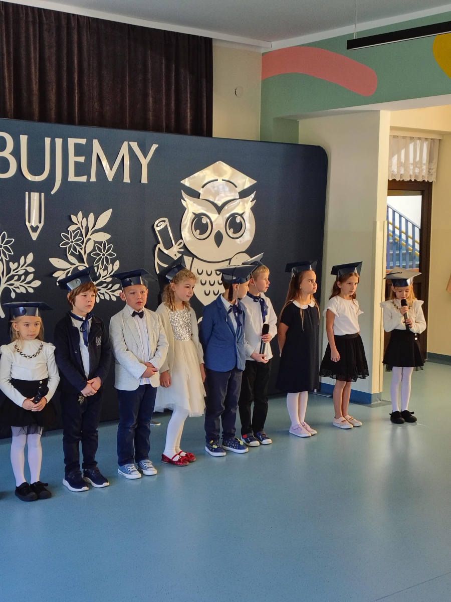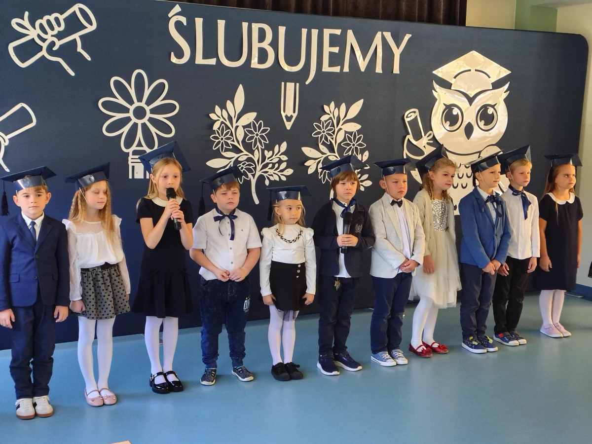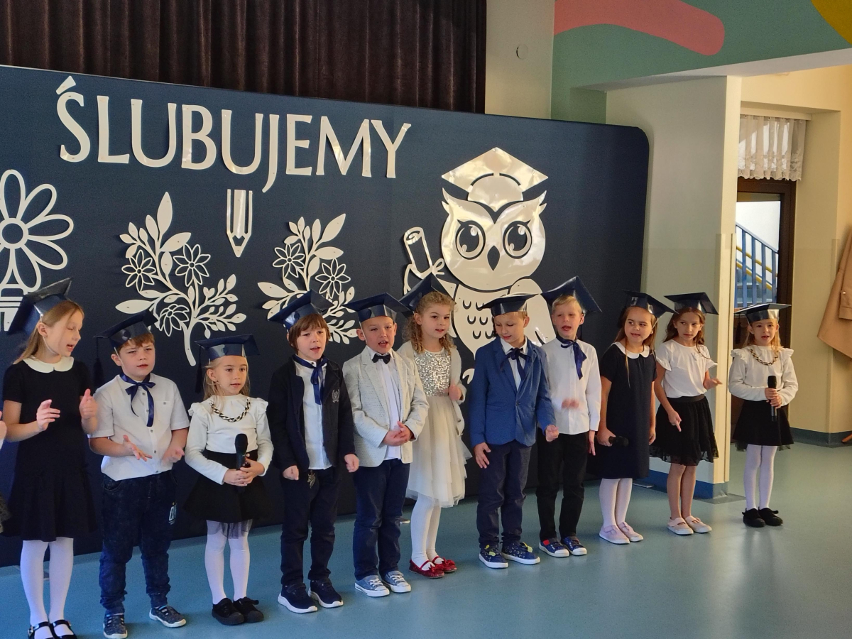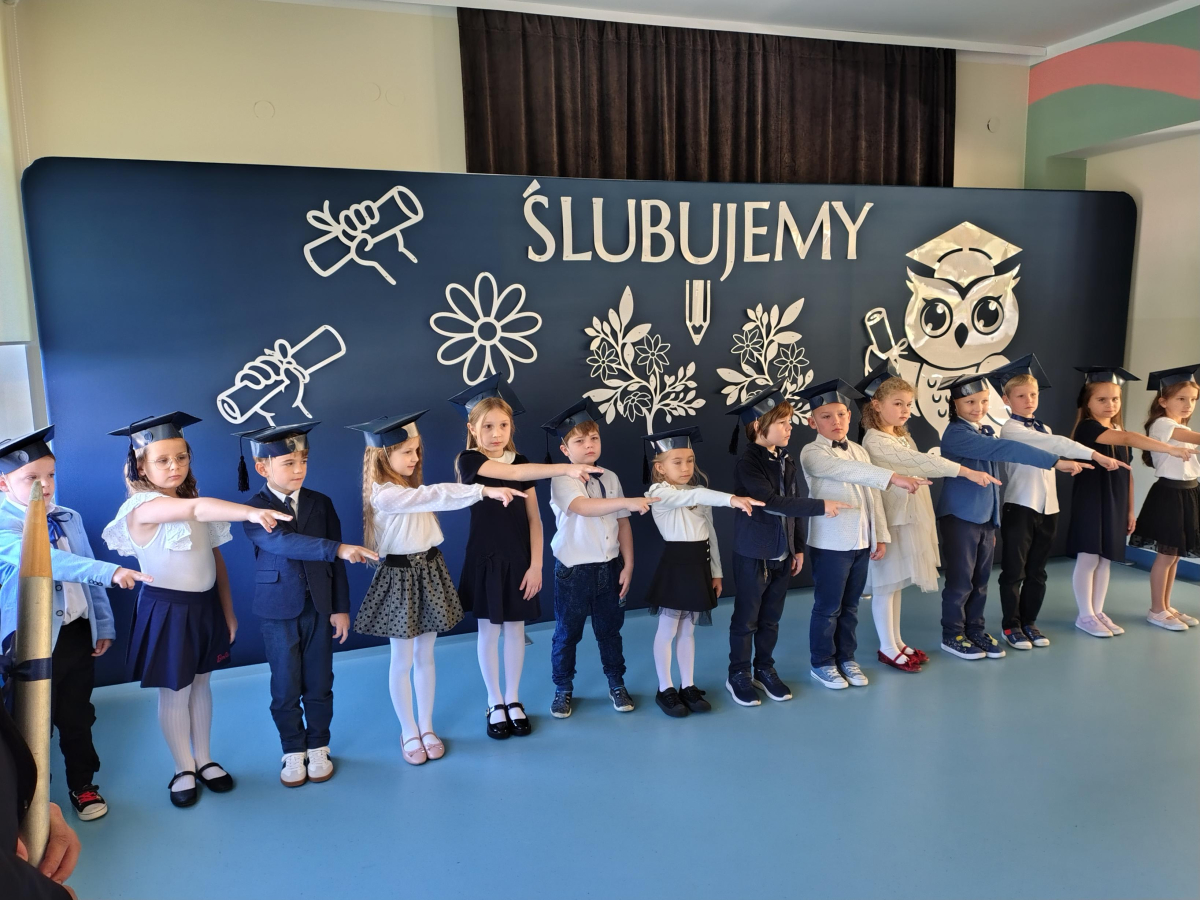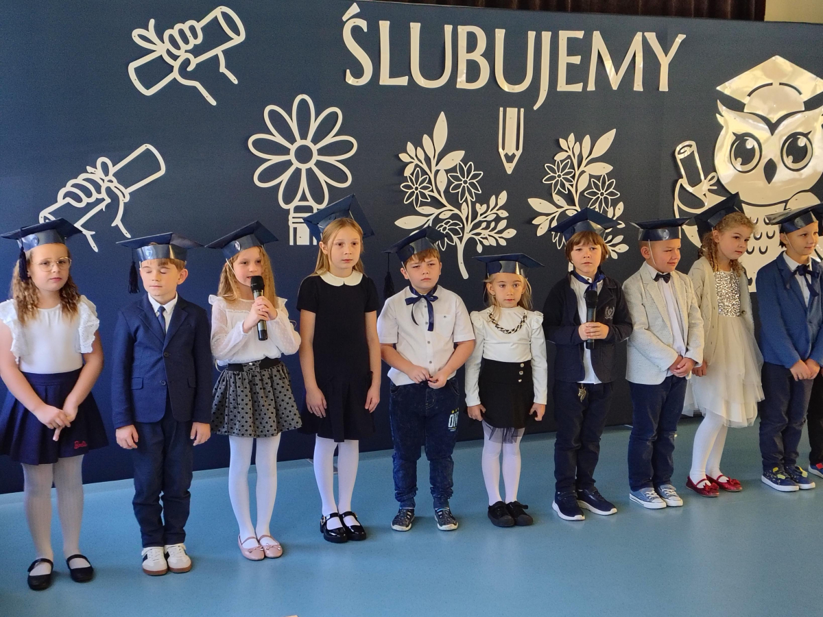 Dnia 16.10.2025 roku swoją uroczystość obchodzili uczniowie klasy pierwszej. Zostali wówczas pasowani na pełnoprawnych uczniów naszej szkoły. Podczas uroczystej akademii nasi pierwszoklasiści uroczyście ślubowali być wzorowymi uczniami, dbać o dobre imię szkoły, pomagać słabszym od siebie oraz sumiennie wykonywać swoje obowiązki. Początkowo jednak musieli zdać egzamin przed rodzicami, nauczycielami, panem dyrektorem oraz starszymi kolegami. Zaprezentowali piosenki w języku angielskim, rymowanki związane z alfabetem oraz znajomością liczb. Zapewnili wszystkich, że zasady właściwego zachowania nie są im obce oraz obiecali, że będą się do nich stosować. Rozwiązali zagadki tematyczne, a tym samym przekonali wszystkich, że zasługują na bycie uczniami naszej szkoły.