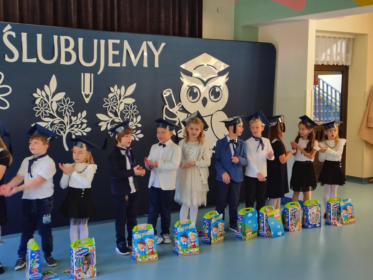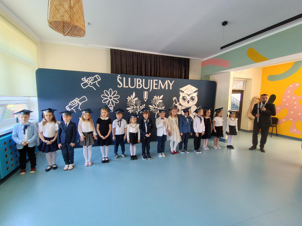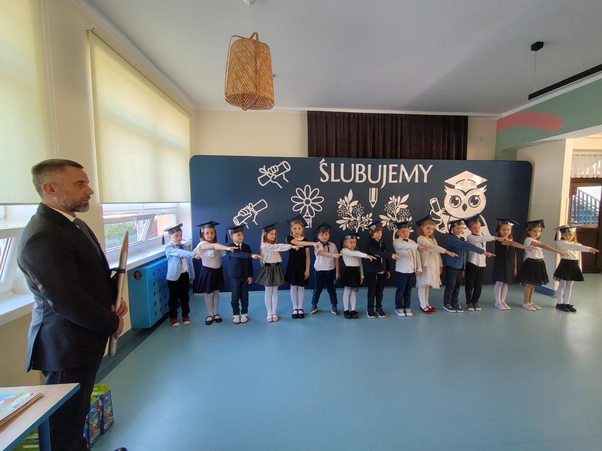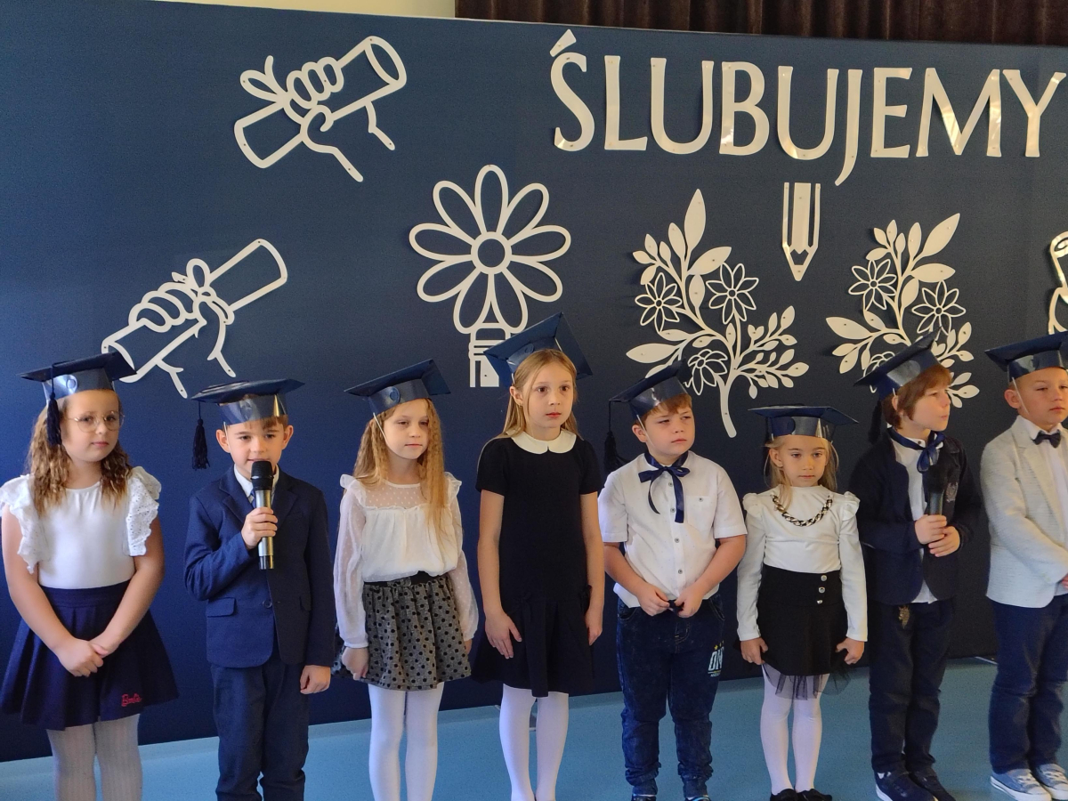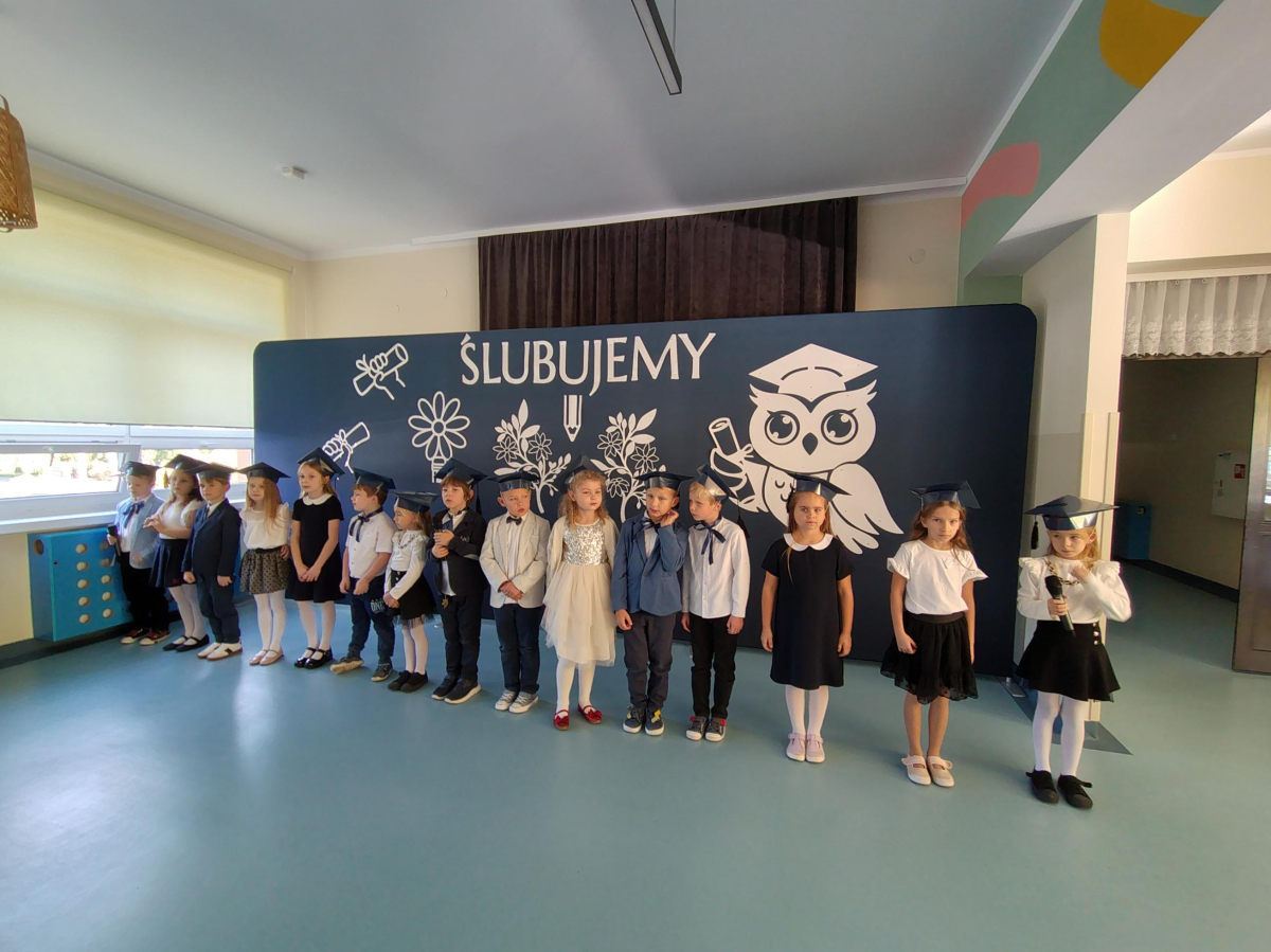 Dnia 16.10.2025 roku swoją uroczystość obchodzili uczniowie klasy pierwszej. Zostali wówczas pasowani na pełnoprawnych uczniów naszej szkoły. Podczas uroczystej akademii nasi pierwszoklasiści uroczyście ślubowali być wzorowymi uczniami, dbać o dobre imię szkoły, pomagać słabszym od siebie oraz sumiennie wykonywać swoje obowiązki. Początkowo jednak musieli zdać egzamin przed rodzicami, nauczycielami, panem dyrektorem oraz starszymi kolegami. Zaprezentowali piosenki w języku angielskim, rymowanki związane z alfabetem oraz znajomością liczb. Zapewnili wszystkich, że zasady właściwego zachowania nie są im obce oraz obiecali, że będą się do nich stosować. Rozwiązali zagadki tematyczne, a tym samym przekonali wszystkich, że zasługują na bycie uczniami naszej szkoły.