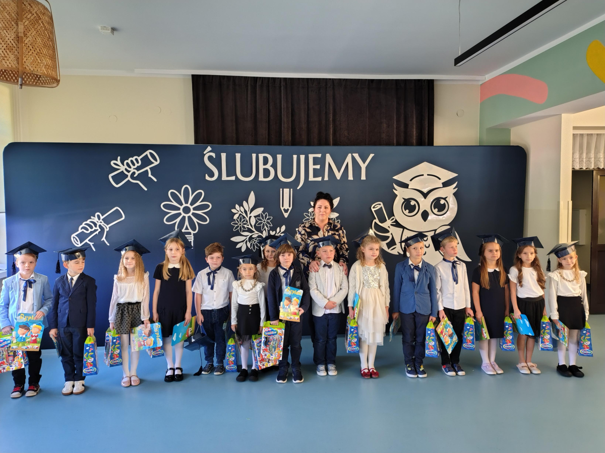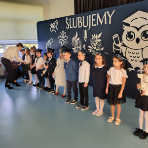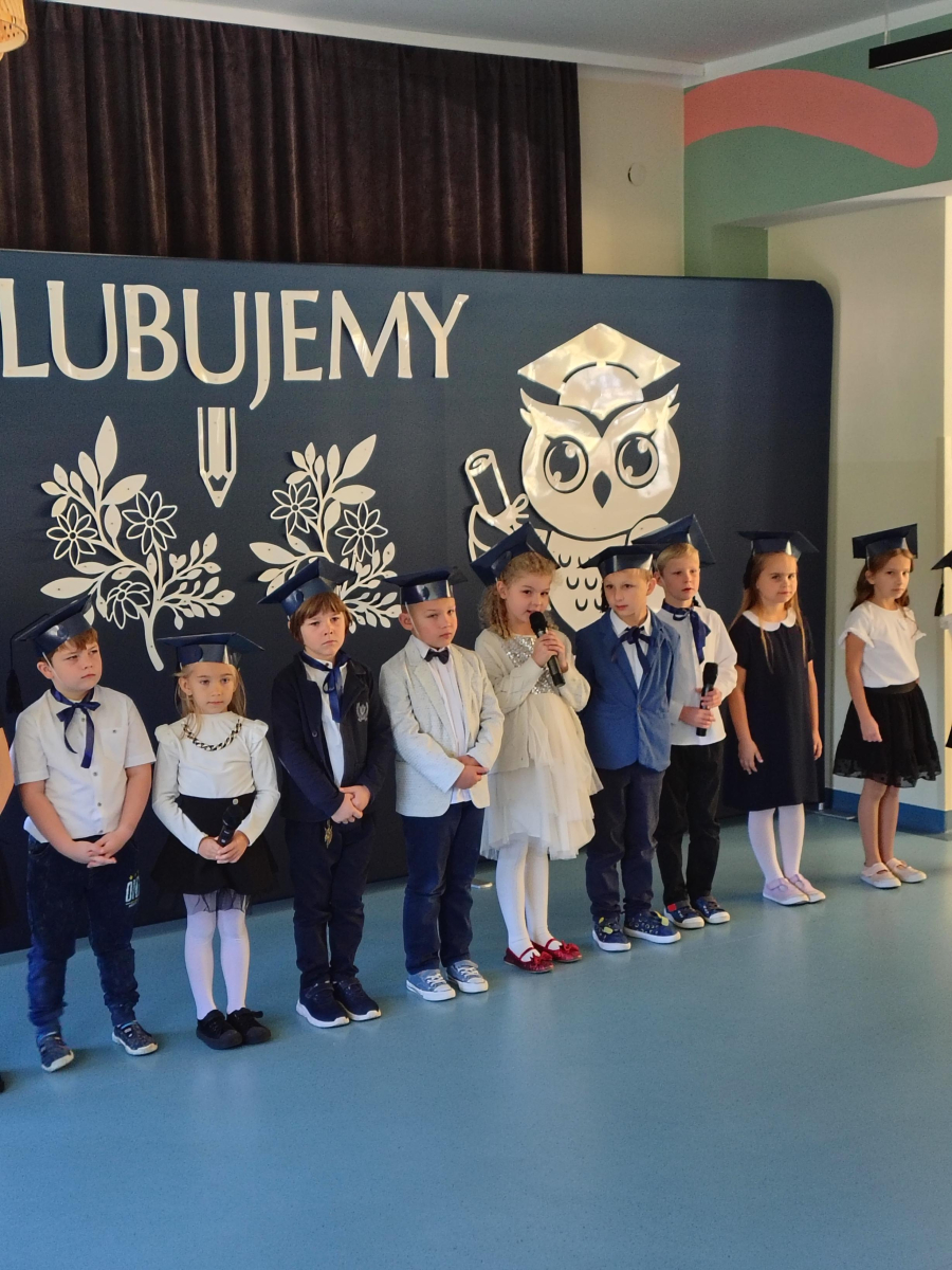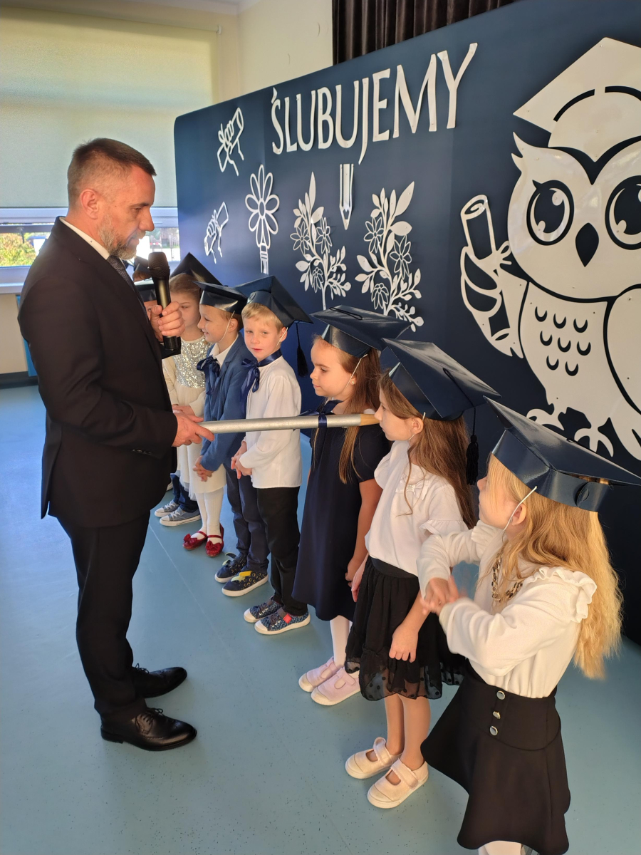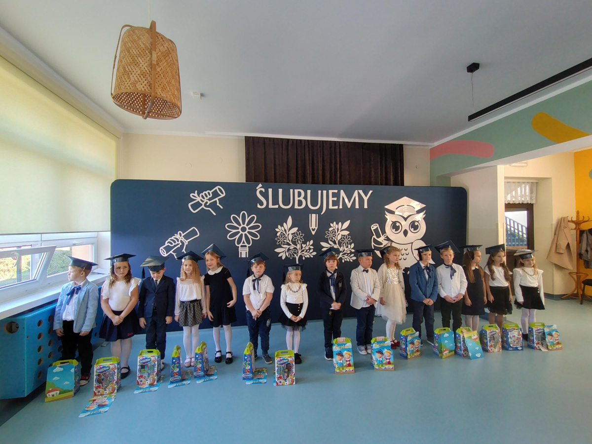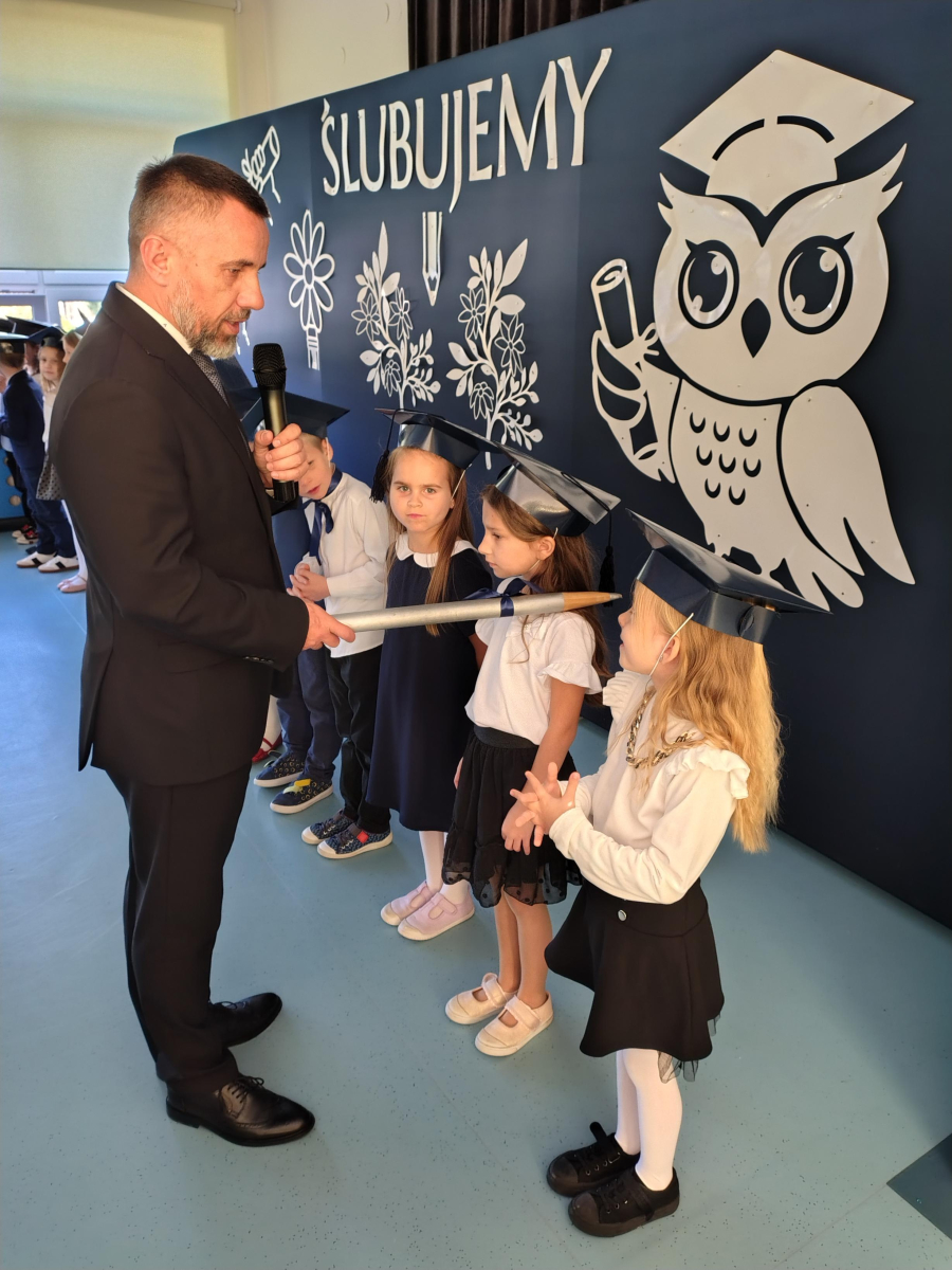 Dnia 16.10.2025 roku swoją uroczystość obchodzili uczniowie klasy pierwszej. Zostali wówczas pasowani na pełnoprawnych uczniów naszej szkoły. Podczas uroczystej akademii nasi pierwszoklasiści uroczyście ślubowali być wzorowymi uczniami, dbać o dobre imię szkoły, pomagać słabszym od siebie oraz sumiennie wykonywać swoje obowiązki. Początkowo jednak musieli zdać egzamin przed rodzicami, nauczycielami, panem dyrektorem oraz starszymi kolegami. Zaprezentowali piosenki w języku angielskim, rymowanki związane z alfabetem oraz znajomością liczb. Zapewnili wszystkich, że zasady właściwego zachowania nie są im obce oraz obiecali, że będą się do nich stosować. Rozwiązali zagadki tematyczne, a tym samym przekonali wszystkich, że zasługują na bycie uczniami naszej szkoły.