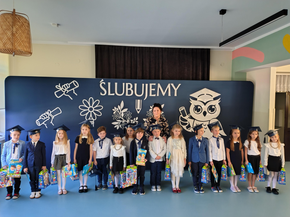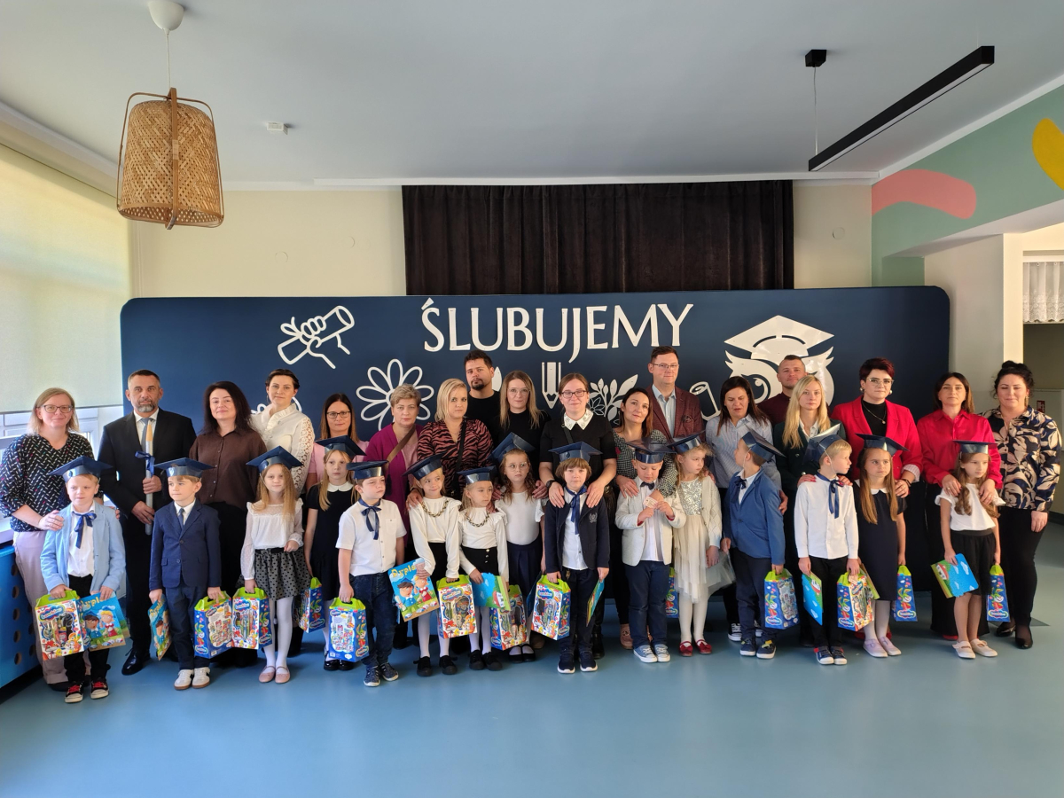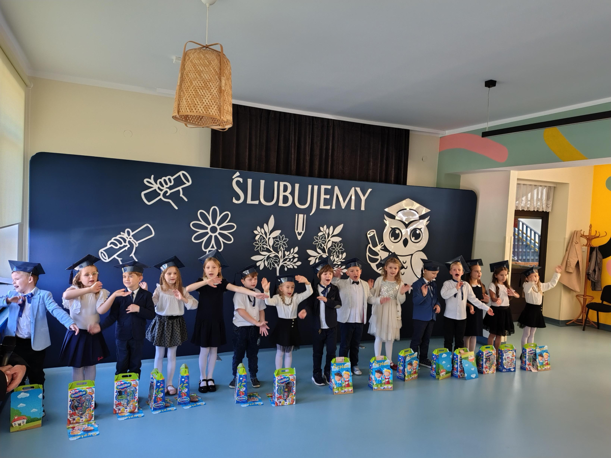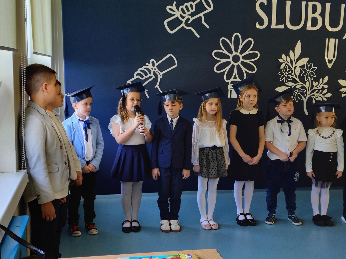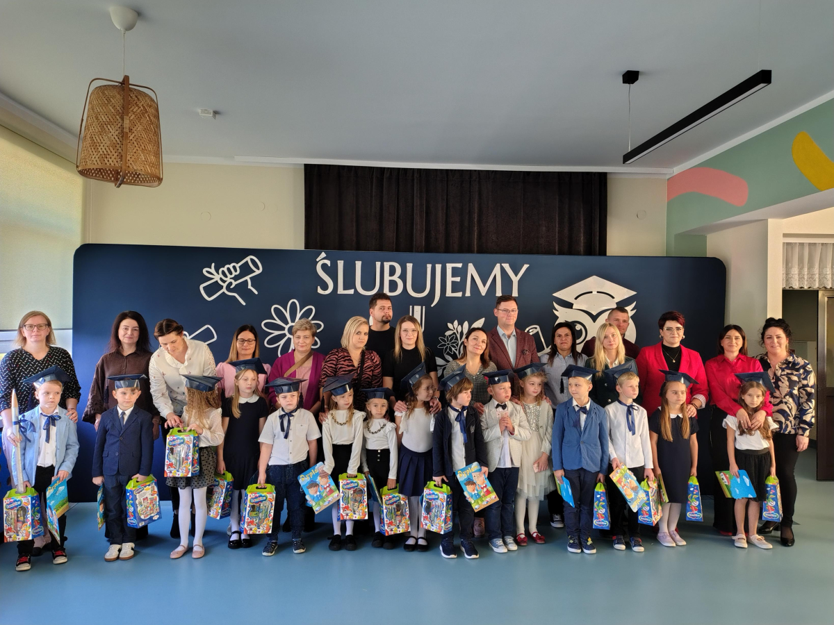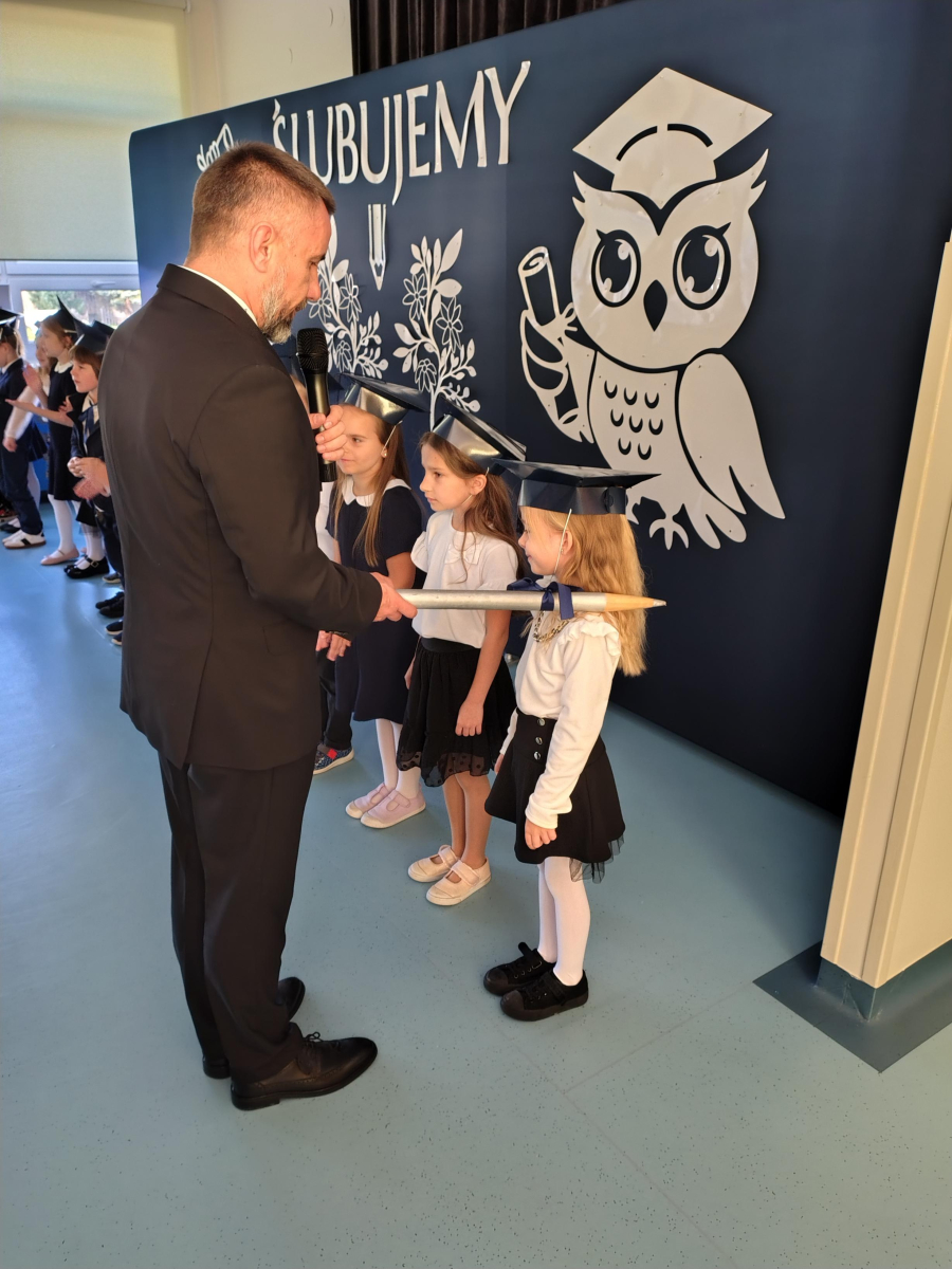 Dnia 16.10.2025 roku swoją uroczystość obchodzili uczniowie klasy pierwszej. Zostali wówczas pasowani na pełnoprawnych uczniów naszej szkoły. Podczas uroczystej akademii nasi pierwszoklasiści uroczyście ślubowali być wzorowymi uczniami, dbać o dobre imię szkoły, pomagać słabszym od siebie oraz sumiennie wykonywać swoje obowiązki. Początkowo jednak musieli zdać egzamin przed rodzicami, nauczycielami, panem dyrektorem oraz starszymi kolegami. Zaprezentowali piosenki w języku angielskim, rymowanki związane z alfabetem oraz znajomością liczb. Zapewnili wszystkich, że zasady właściwego zachowania nie są im obce oraz obiecali, że będą się do nich stosować. Rozwiązali zagadki tematyczne, a tym samym przekonali wszystkich, że zasługują na bycie uczniami naszej szkoły.