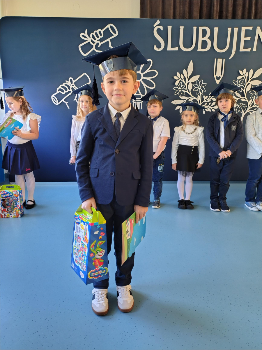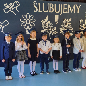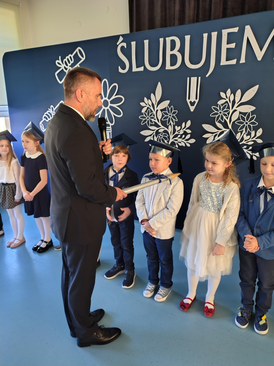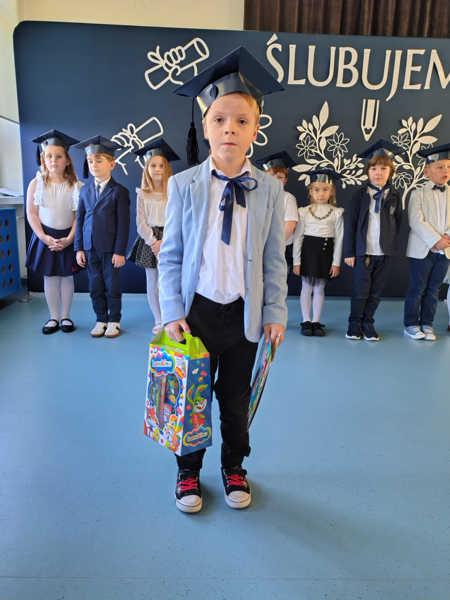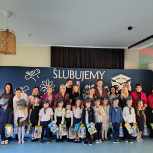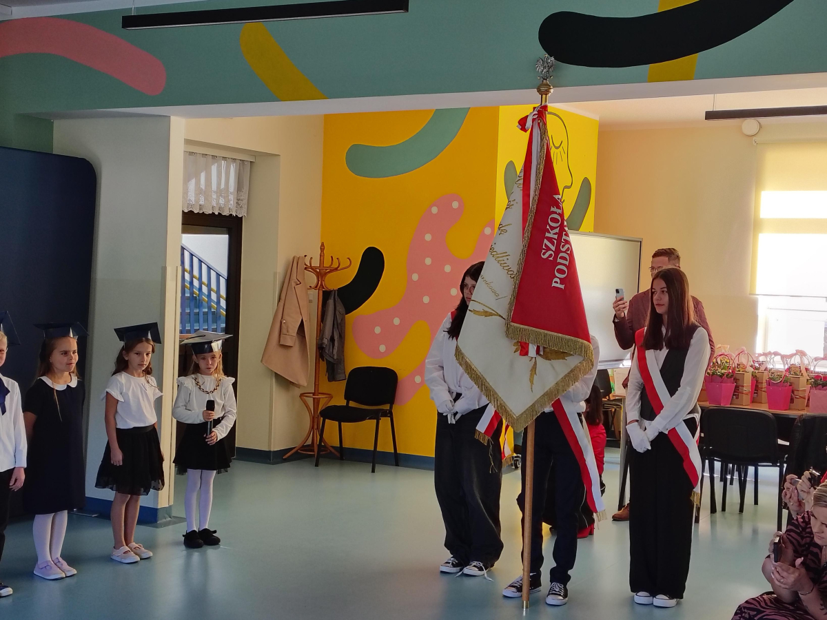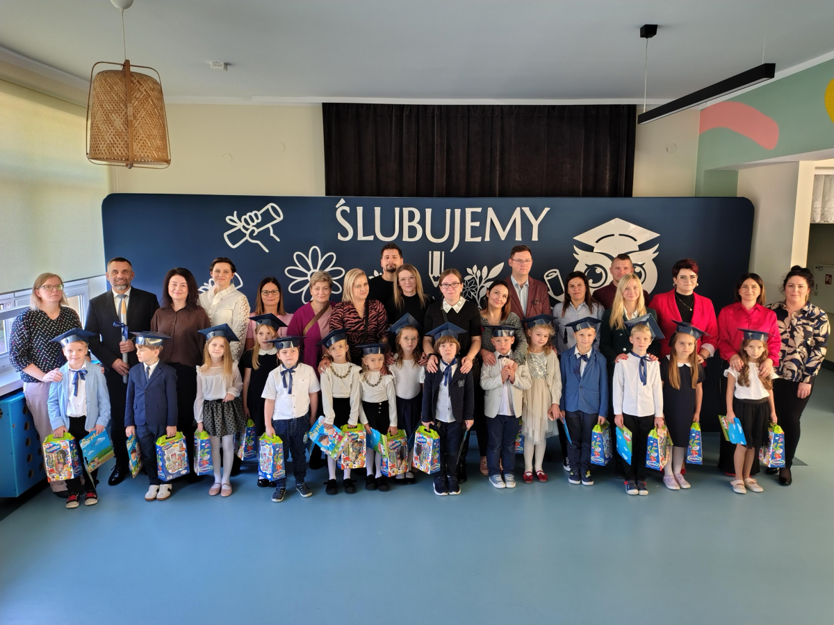 Dnia 16.10.2025 roku swoją uroczystość obchodzili uczniowie klasy pierwszej. Zostali wówczas pasowani na pełnoprawnych uczniów naszej szkoły. Podczas uroczystej akademii nasi pierwszoklasiści uroczyście ślubowali być wzorowymi uczniami, dbać o dobre imię szkoły, pomagać słabszym od siebie oraz sumiennie wykonywać swoje obowiązki. Początkowo jednak musieli zdać egzamin przed rodzicami, nauczycielami, panem dyrektorem oraz starszymi kolegami. Zaprezentowali piosenki w języku angielskim, rymowanki związane z alfabetem oraz znajomością liczb. Zapewnili wszystkich, że zasady właściwego zachowania nie są im obce oraz obiecali, że będą się do nich stosować. Rozwiązali zagadki tematyczne, a tym samym przekonali wszystkich, że zasługują na bycie uczniami naszej szkoły.