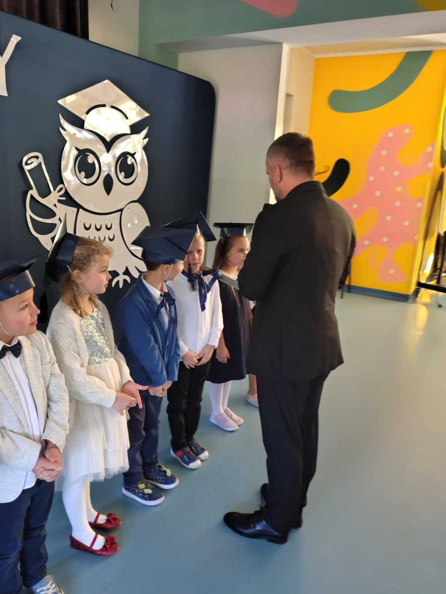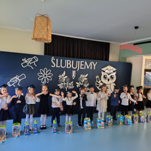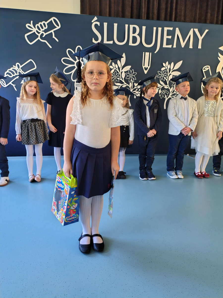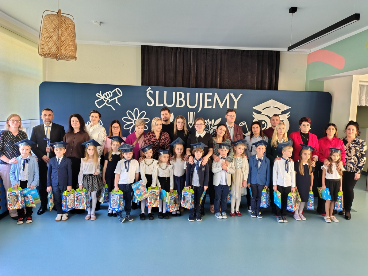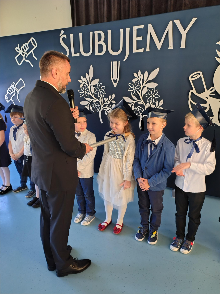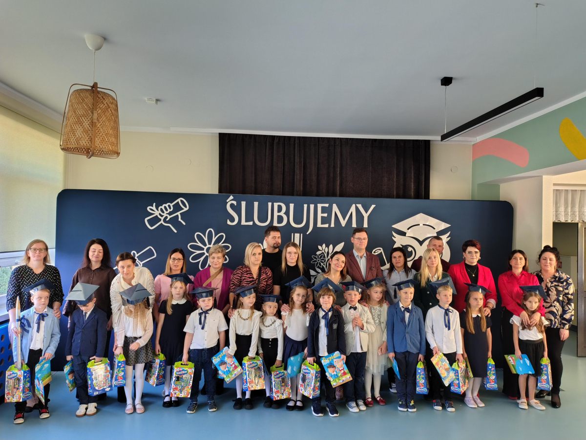 Dnia 16.10.2025 roku swoją uroczystość obchodzili uczniowie klasy pierwszej. Zostali wówczas pasowani na pełnoprawnych uczniów naszej szkoły. Podczas uroczystej akademii nasi pierwszoklasiści uroczyście ślubowali być wzorowymi uczniami, dbać o dobre imię szkoły, pomagać słabszym od siebie oraz sumiennie wykonywać swoje obowiązki. Początkowo jednak musieli zdać egzamin przed rodzicami, nauczycielami, panem dyrektorem oraz starszymi kolegami. Zaprezentowali piosenki w języku angielskim, rymowanki związane z alfabetem oraz znajomością liczb. Zapewnili wszystkich, że zasady właściwego zachowania nie są im obce oraz obiecali, że będą się do nich stosować. Rozwiązali zagadki tematyczne, a tym samym przekonali wszystkich, że zasługują na bycie uczniami naszej szkoły.