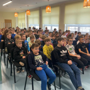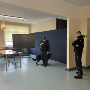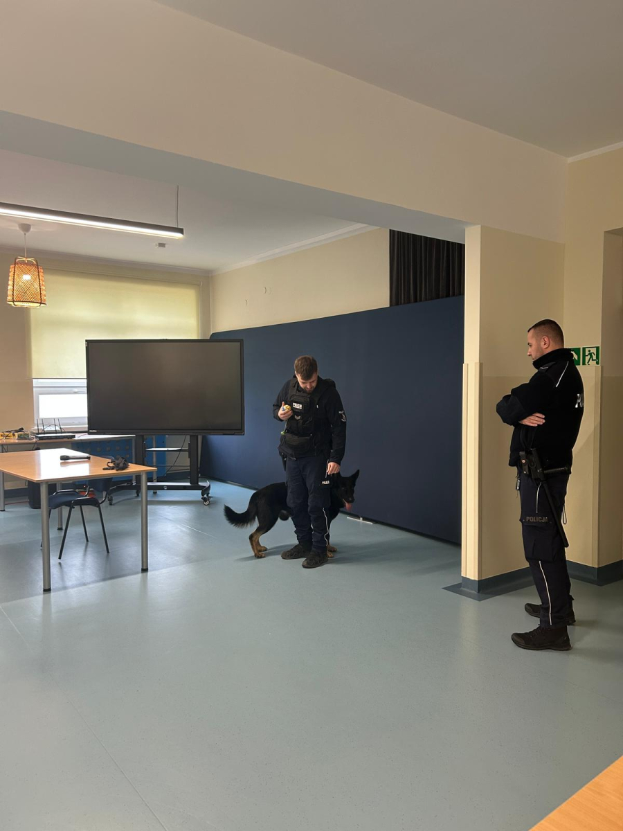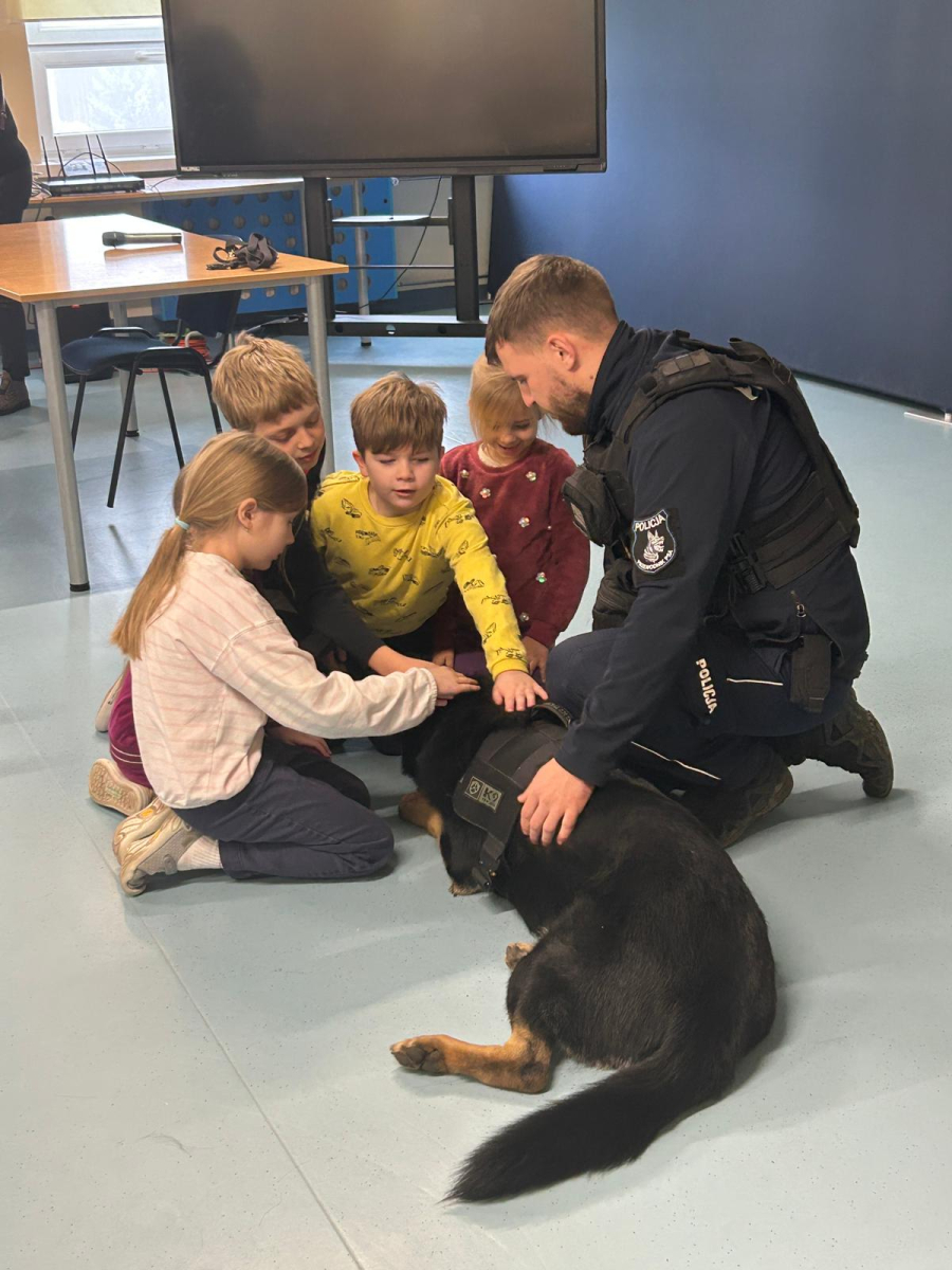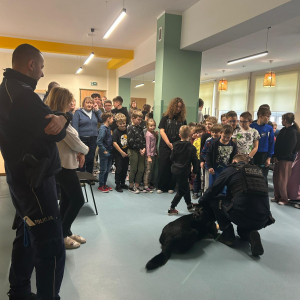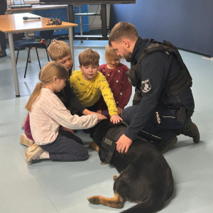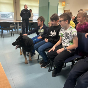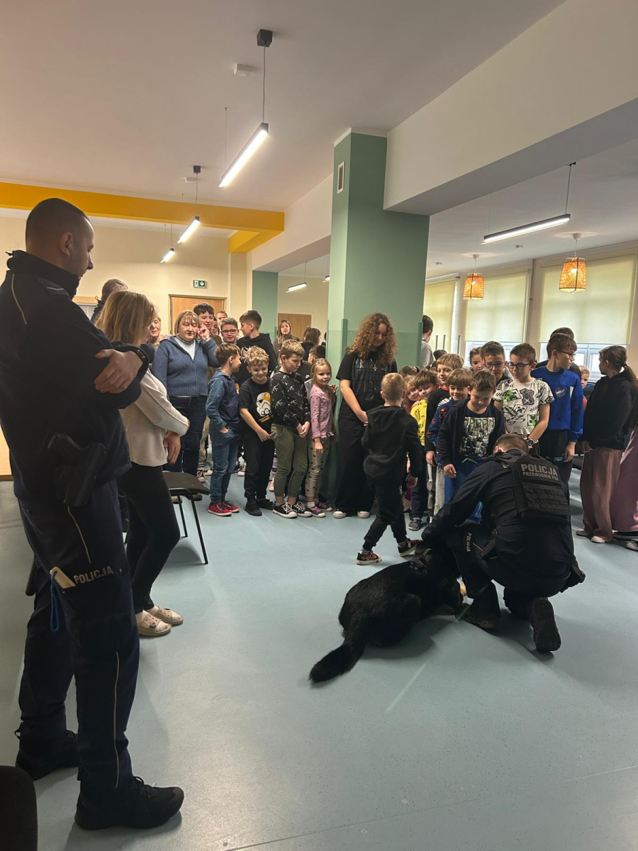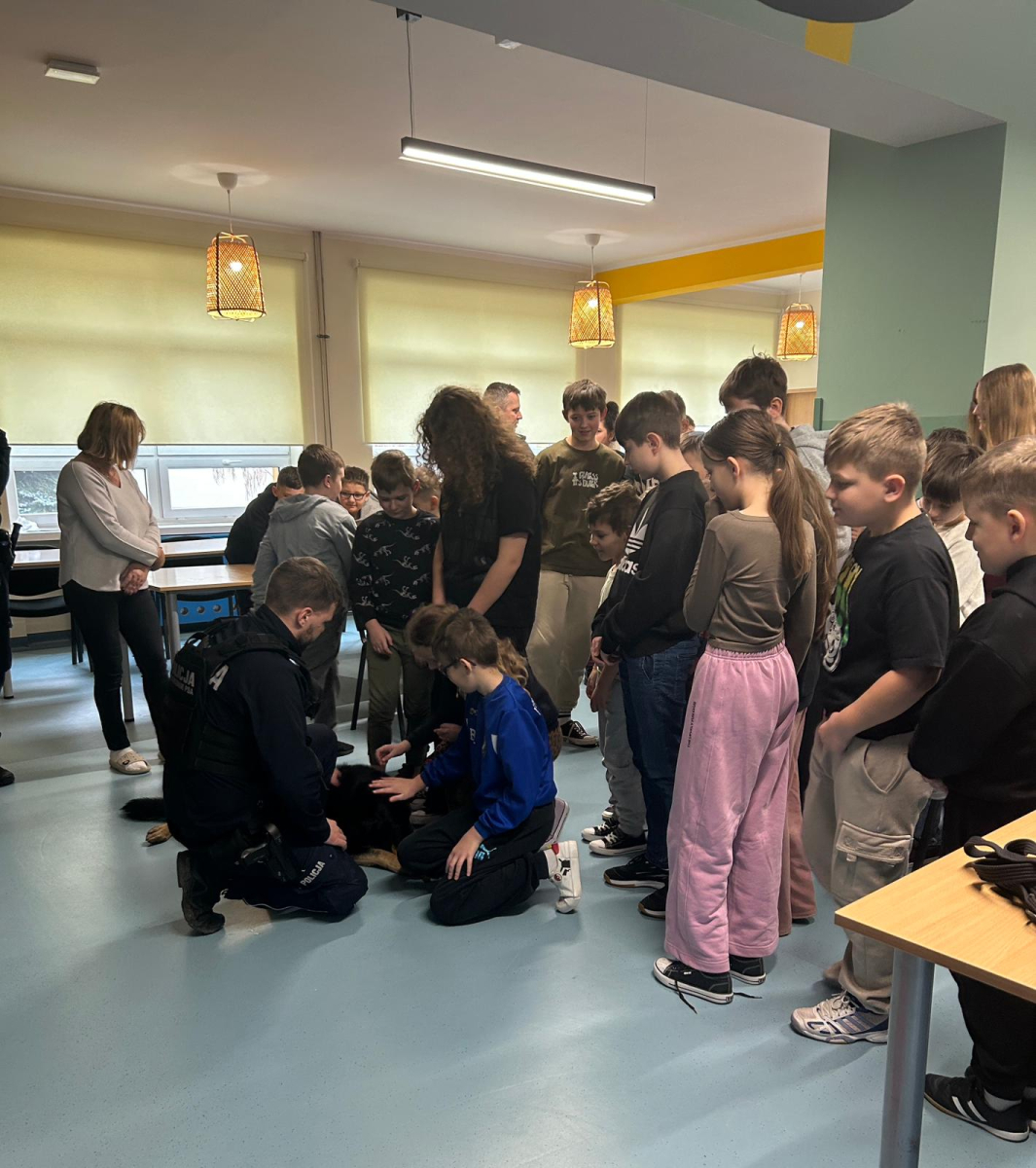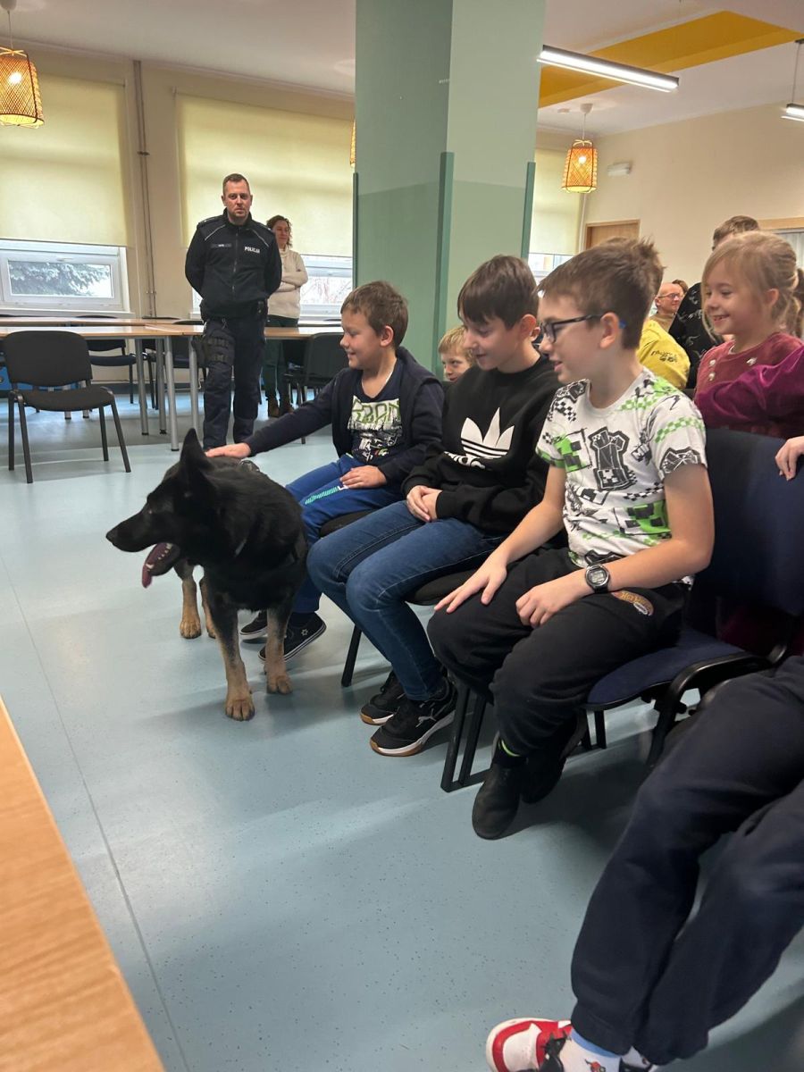Szkołę odwiedził również policyjny pies, a jego opiekun opowiedział o ich wspólnej pracy. Dzieci miały możliwość zobaczyć umiejętności psa, a także pogłaskać go, co wzbudziło duże zainteresowanie i radość wśród uczniów.