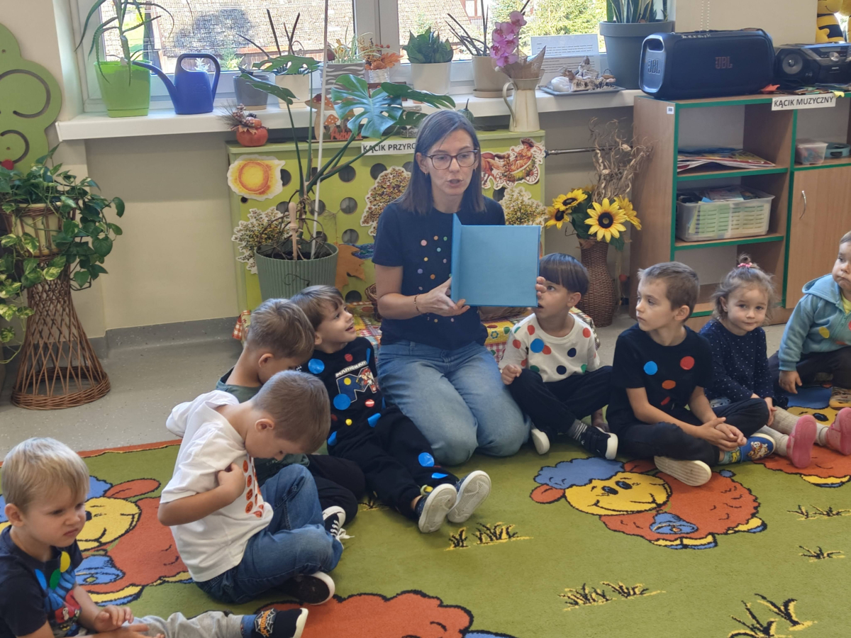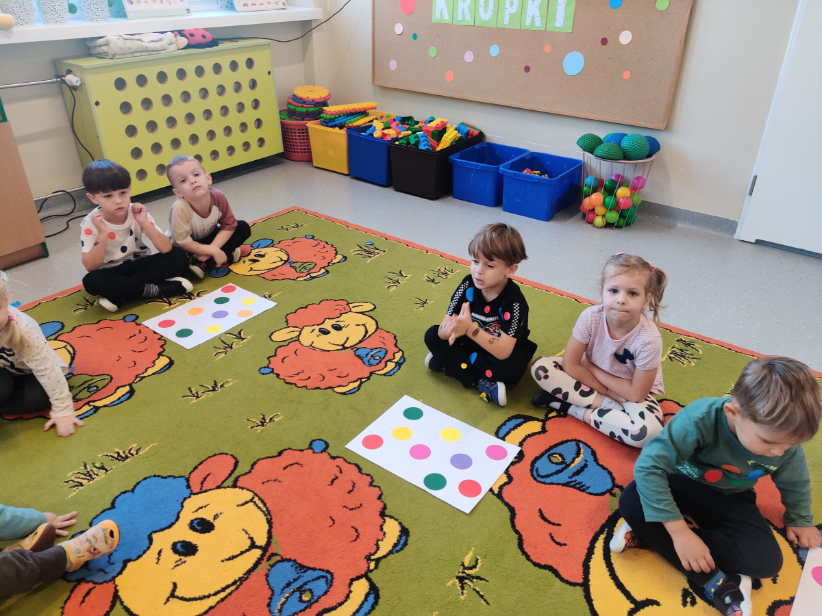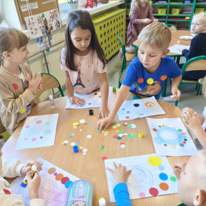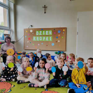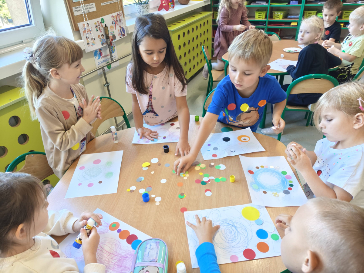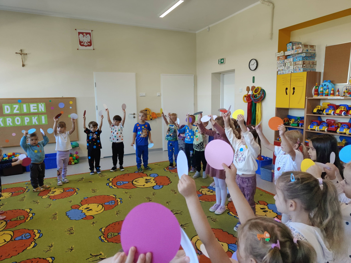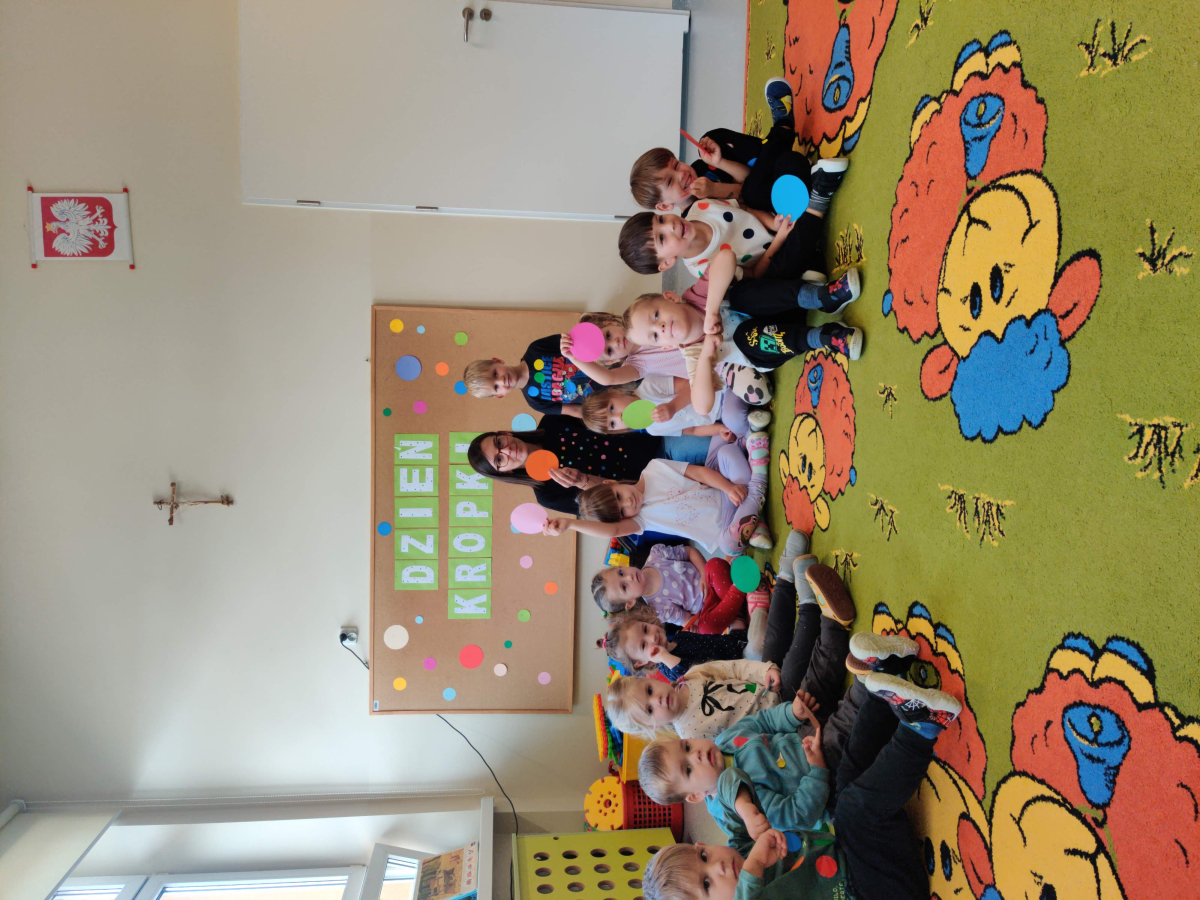 W naszym przedszkolu świętowaliśmy Międzynarodowy Dzień Kropki- wyjątkowe święto kreatywności, odwagi i zabawy. Dzieci rozpoczęły dzień od wspólnego tańca do piosenki “Kropka, kropeczka”. Następnie przedszkolaki z zaciekawieniem wysłuchały opowiadania z książki “Kropka i kreska”, mówiące o przyjaźni, tolerancji i radości z wspólnej zabawy. Po części wprowadzającej dzieci pracowały w grupach. Starszaki zmierzyły się z zadaniem z zakresu kodowania, natomiast młodsze przedszkolaki świetnie się bawiły segregując kubeczki według koloru. Kolejnym etapem było wykonanie pracy plastycznej według metody D. Dziamskiej. Do zabawy włączyliśmy także rodziców. Na korytarzu przygotowaliśmy kartki z kropkami, do których dzieci i dorośli mogli dorysowywać własne pomysły. Wszystkie zadania przygotowane dla dzieci rozwijały kreatywność, logiczne myślenie, doskonaliły umiejętności grafomotoryczne i współpracę w grupie. Był to dzień pełen radości.