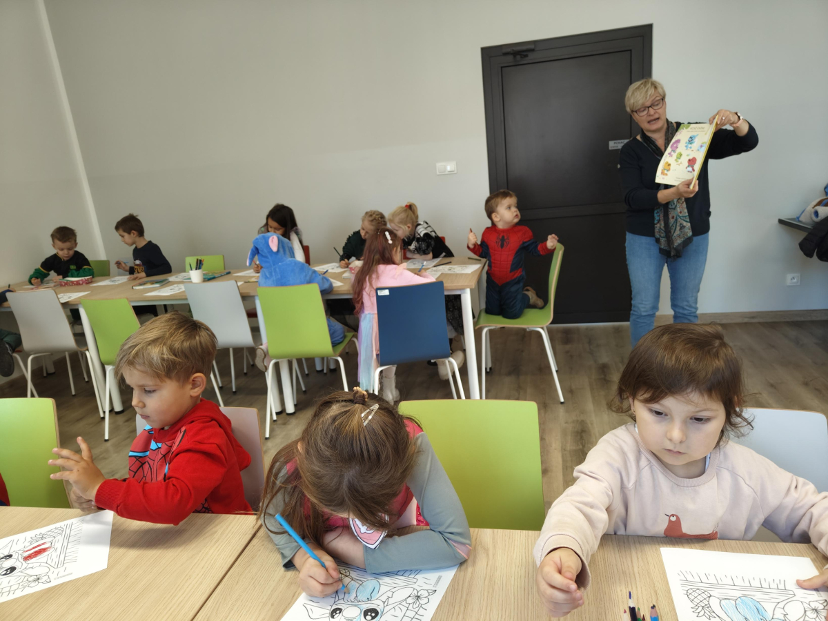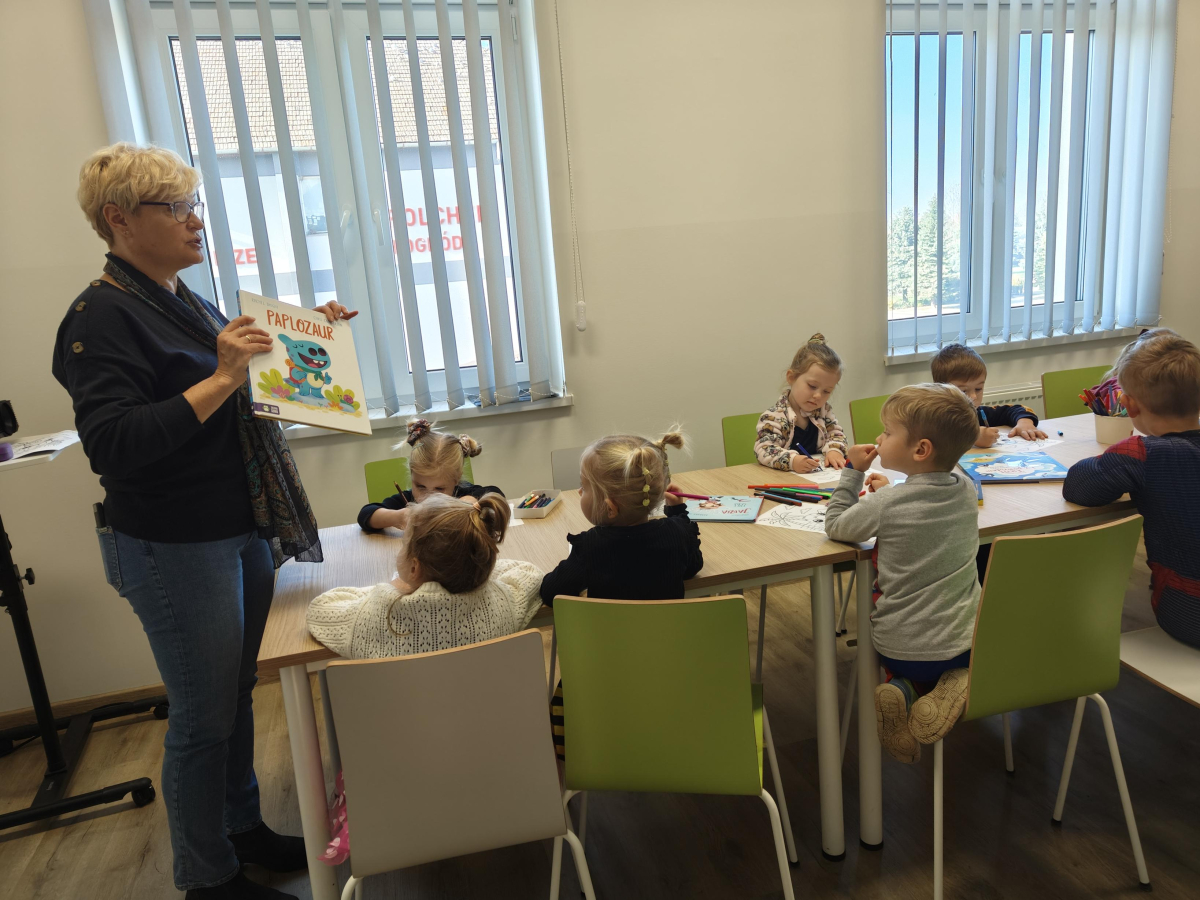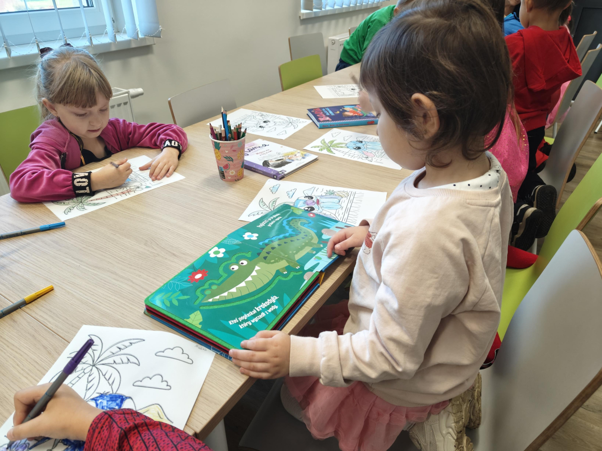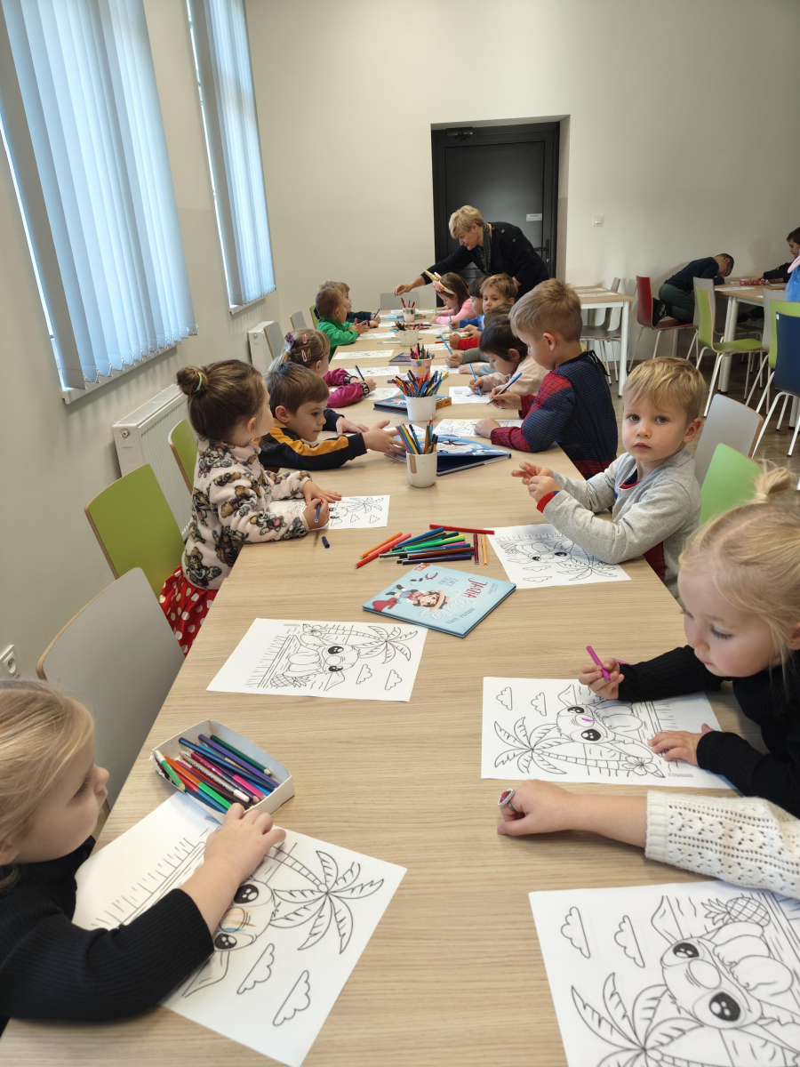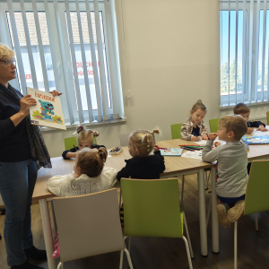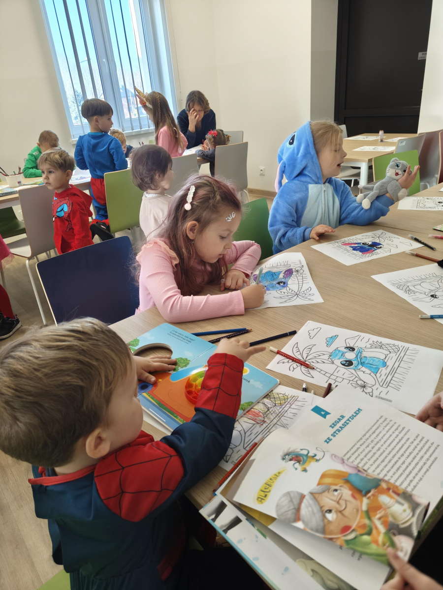 Przedszkolaki brały udział w tematycznych zabawach, między innymi w memory z bohaterami bajek oraz w rozpoznawaniu akcesoriów pochodzących z różnych opowieści. Kolejną atrakcją była wizyta w Bibliotece Publicznej w Uściu Solnym. Pani Bibliotekarka Agnieszka Dobrzańska przeczytała dzieciom bajkę pt.” Lilo i Stich”, która przeniosła je w magiczny świat opowieści. Następnie dzieci kolorowały postaci bajkowe i oglądały nowości książkowe.