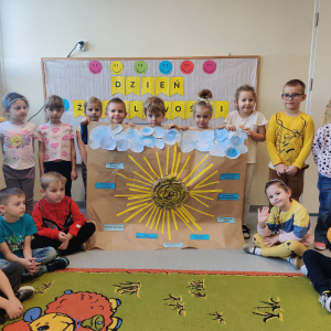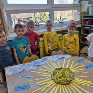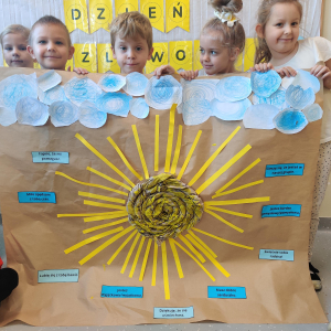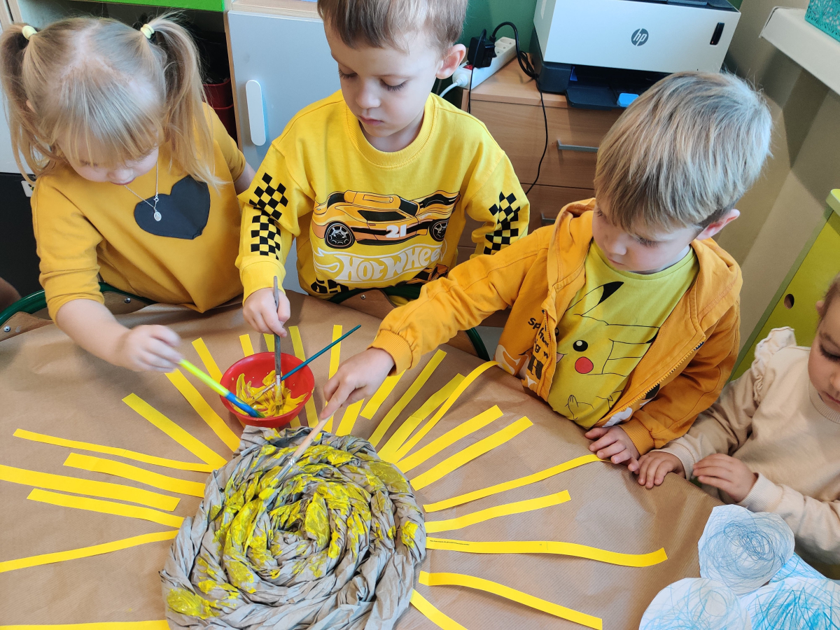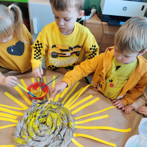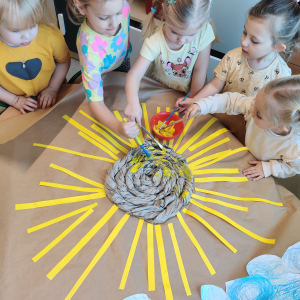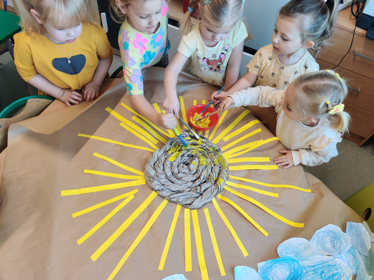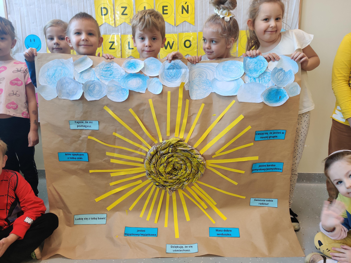 Następnie przyszedł czas na działanie twórcze, wykonane według metody D. Dziamskiej Edukacja Przez Ruch. Przy melodii, trzymając się za ręce, dzieci poruszały się w rytm muzyki, ćwicząc dłonie i nadgarstki poprzez kreślenie kolistych wzorów. Powstałe rysunki zamieniły się w „chmurki”, które przedszkolaki samodzielnie wycinały i nadawały im kształt. Wszystkie elementy posłużyły do stworzenia wspólnej Krainy Życzliwości, w której centralne miejsce zajęło słońce z promieniami – symbolem dobra, radości i pozytywnego nastawienia.