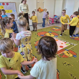 W kolejnej zabawie – „Podaj słowo” – dzieci wykorzystały kolorowe klamerki do przekazywania sobie obrazków przedstawiających dobre i miłe słowa. Dzięki temu ćwiczeniu mogły utrwalać słownictwo związane z pozytywnymi emocjami oraz uczyć się, jak ważne jest mówienie sobie nawzajem: proszę, dziękuję, przepraszam, dzień dobry, do widzenia.